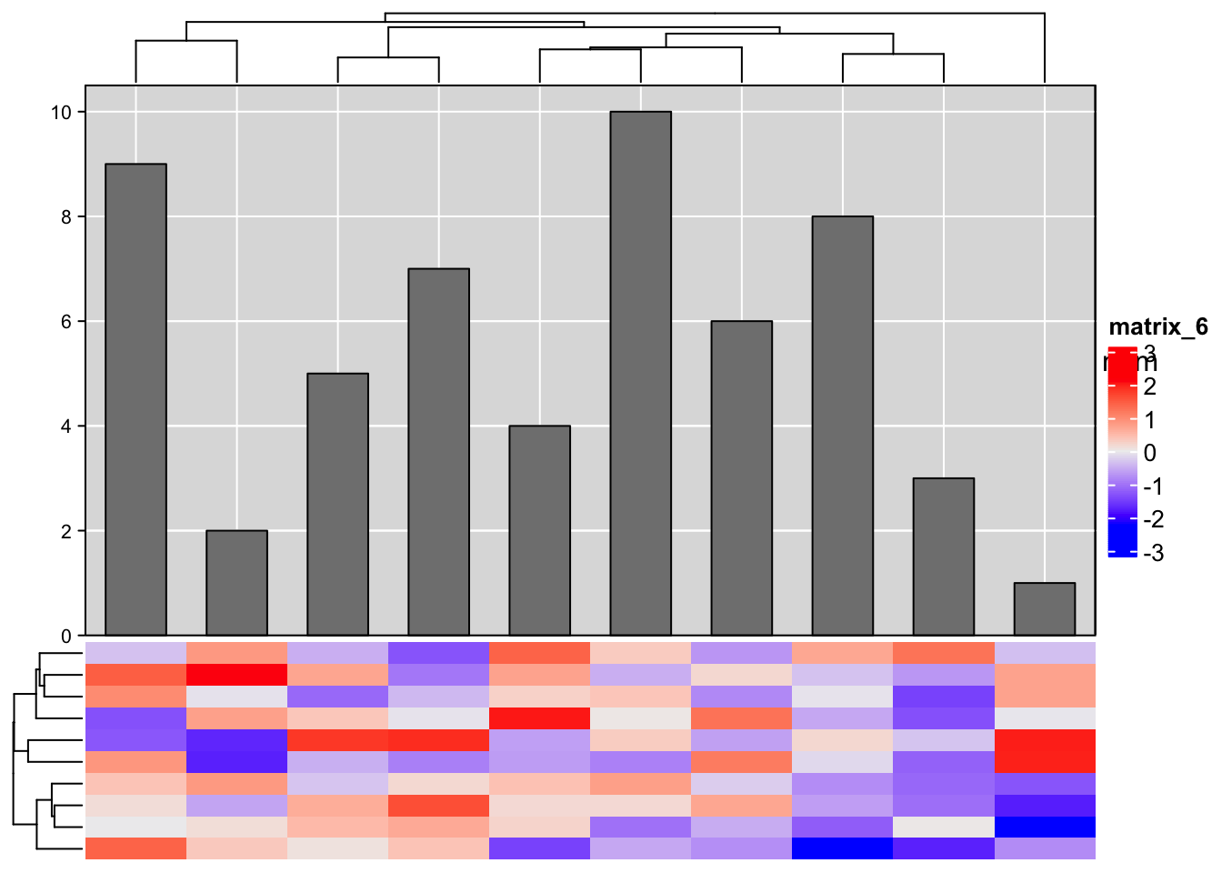 Heatmap(m, top_annotation = HeatmapAnnotation(num = anno_barplot(1:10), height = unit(8, "cm")))