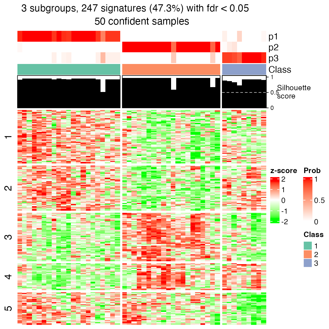 get_signatures(res2, k = suggest_best_k(res2))## * 47/50 samples (in 3 classes) remain after filtering by silhouette (>= 0.5).