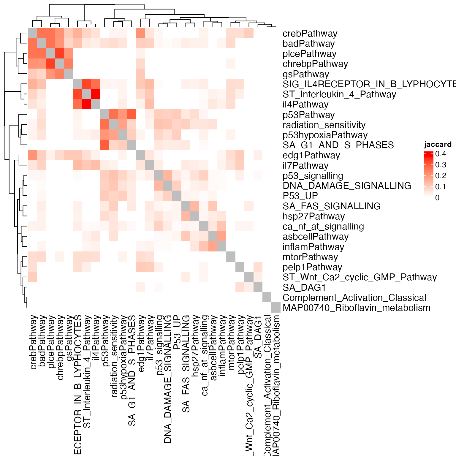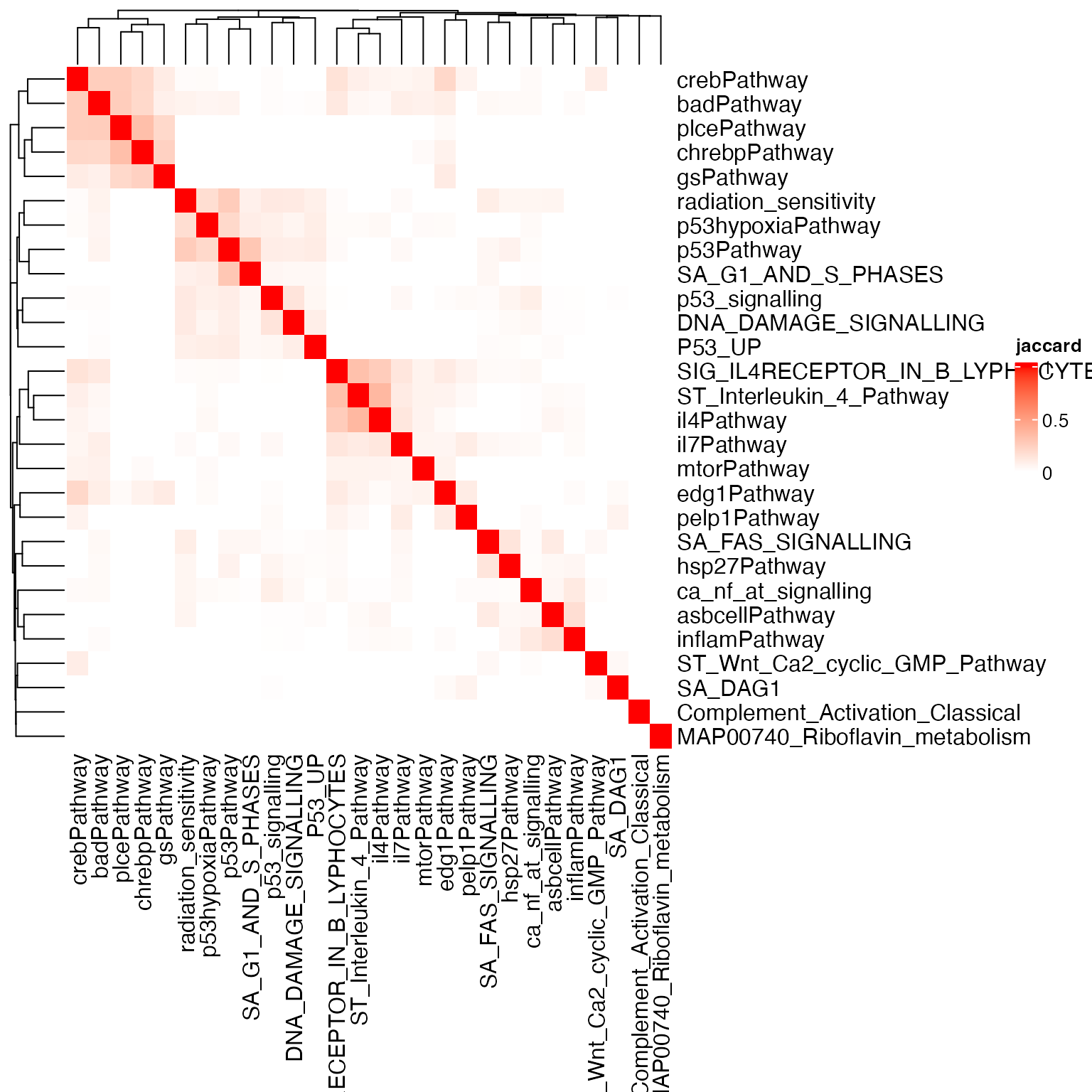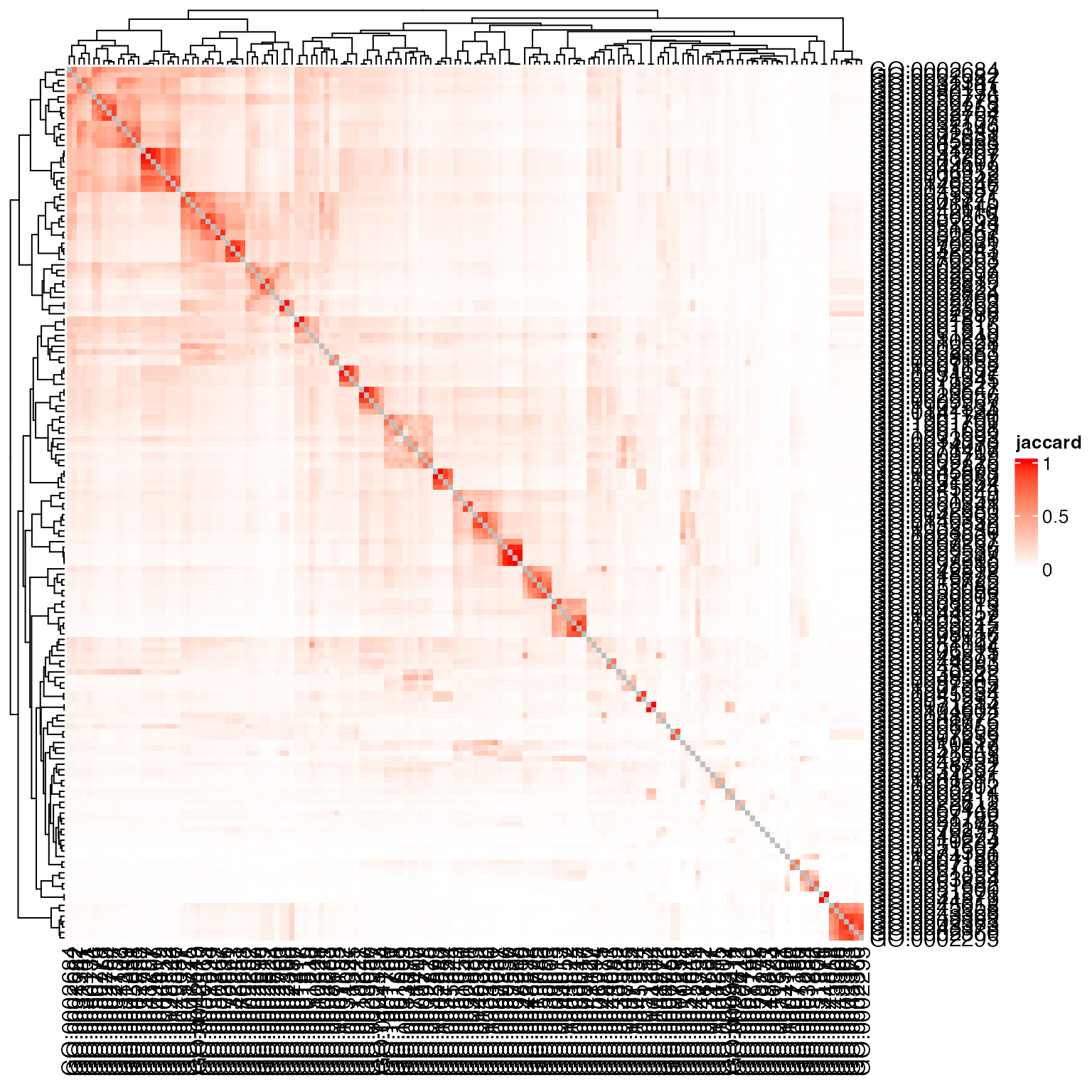 Heatmap(sm, name = "jaccard", col = c("white", "red"))