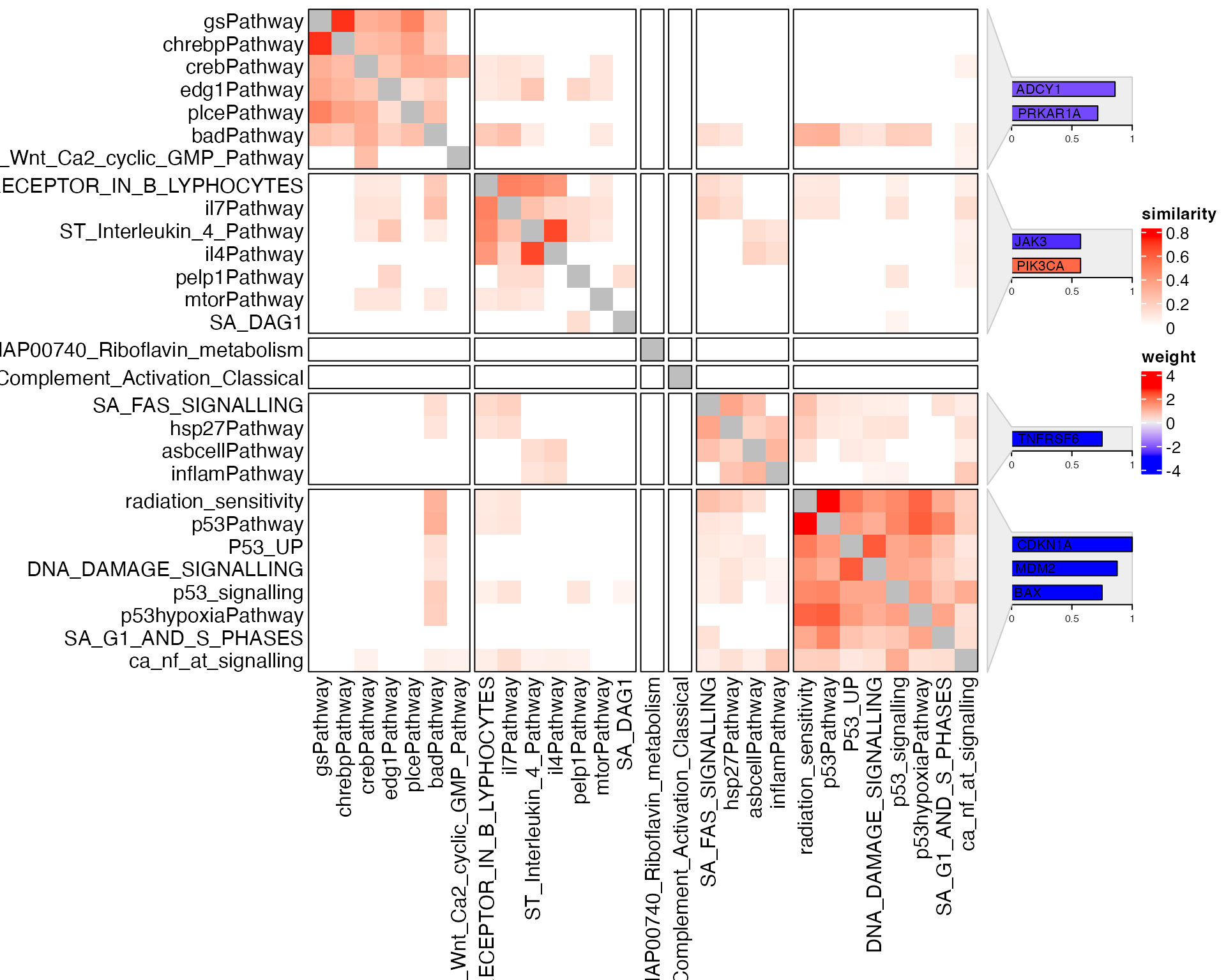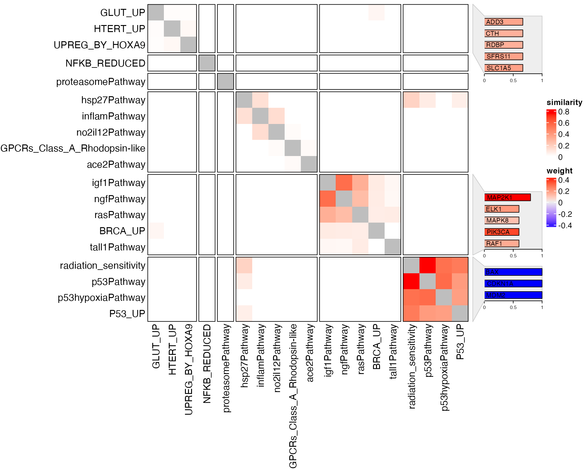We can see “CDKN1A” is in all 8 genesets, “MDM2” is in 7 out of 8 gene sets, and “BAX” is in 6 out of 8 gene sets. So these three genes are driving genes of the eight genesets in this cluster.