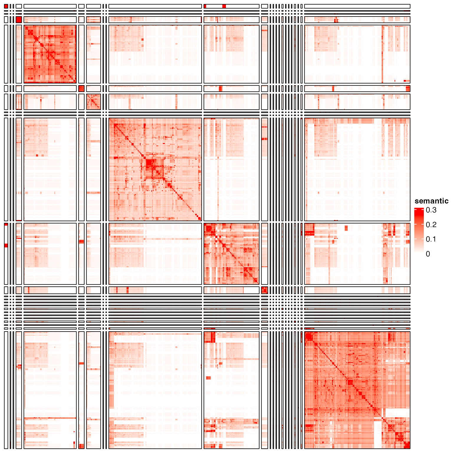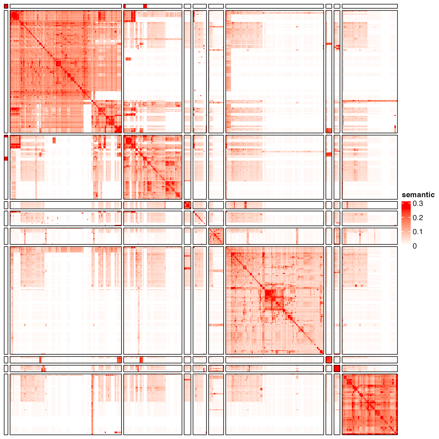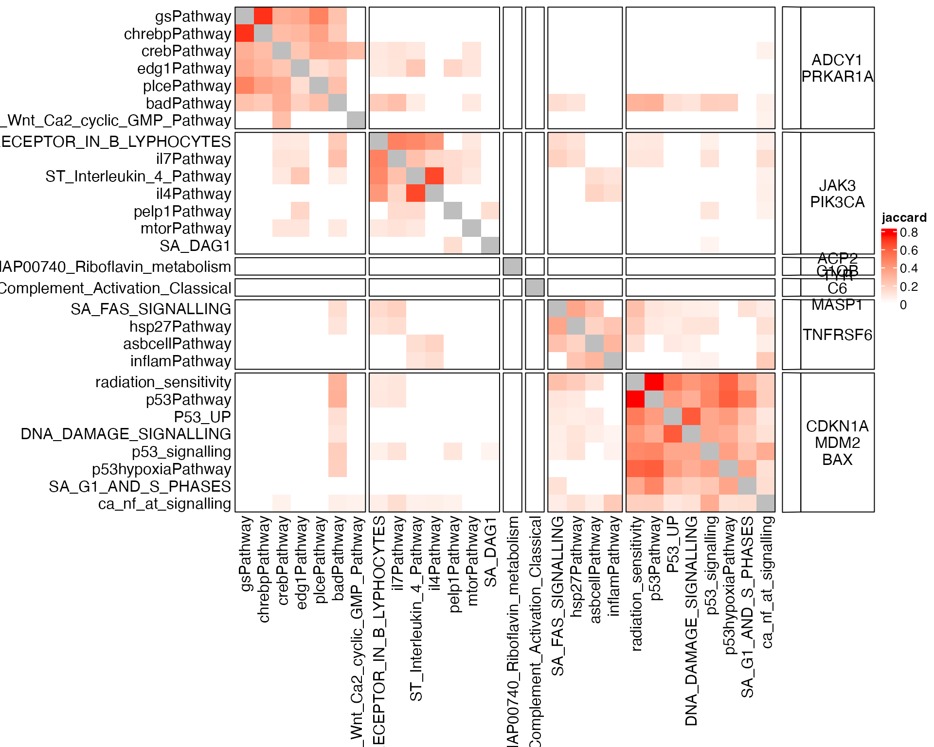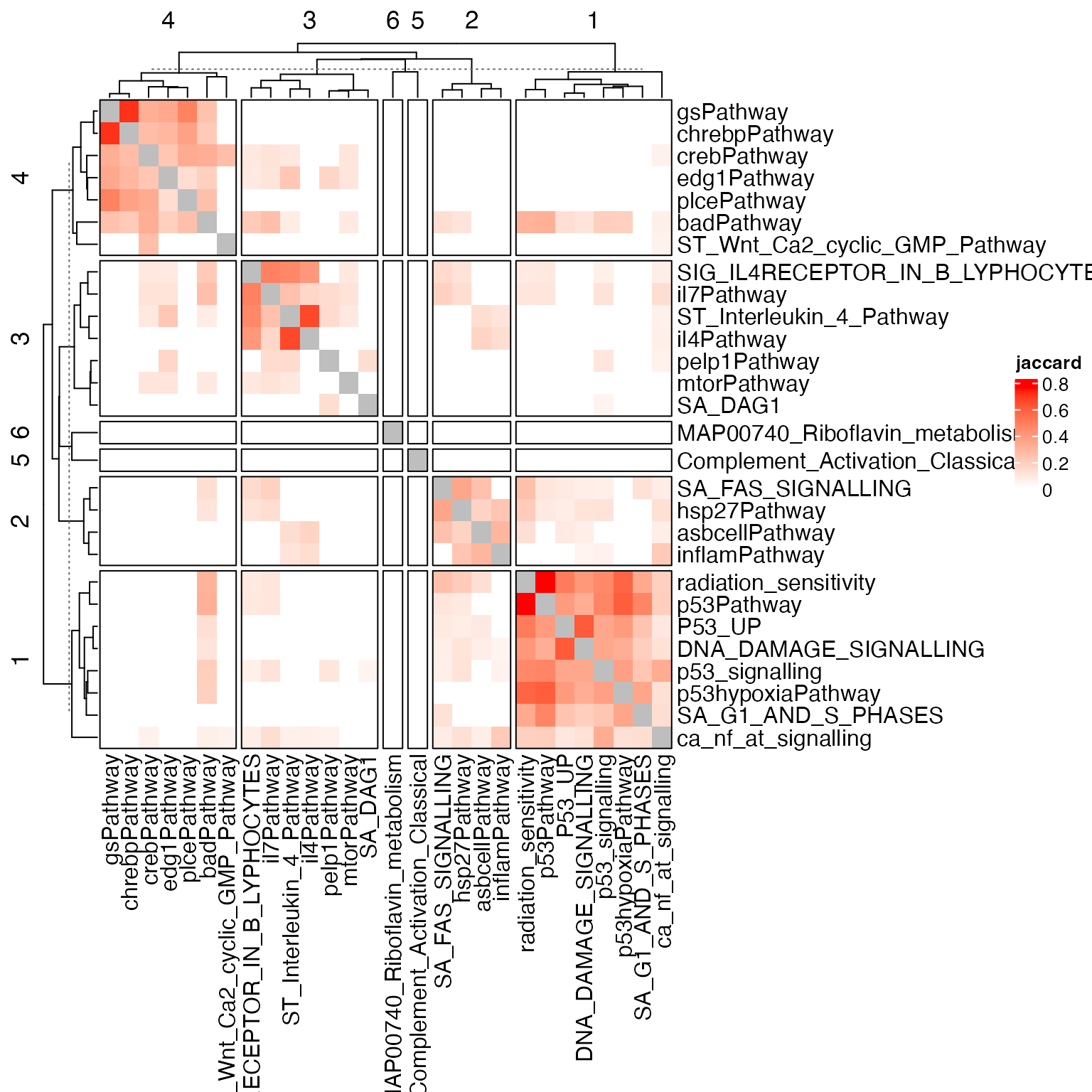 Clustering the gene sets is fairly easy. However, this is not the end of the analysis. We need to summarize the commonness of genesets in a cluster. Note the similarity is count-based, then these genesets must share some common genes, i.e., the driving genes that cluster the genesets.