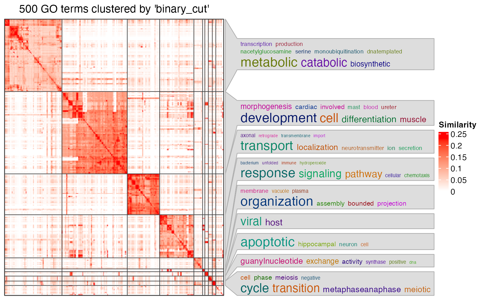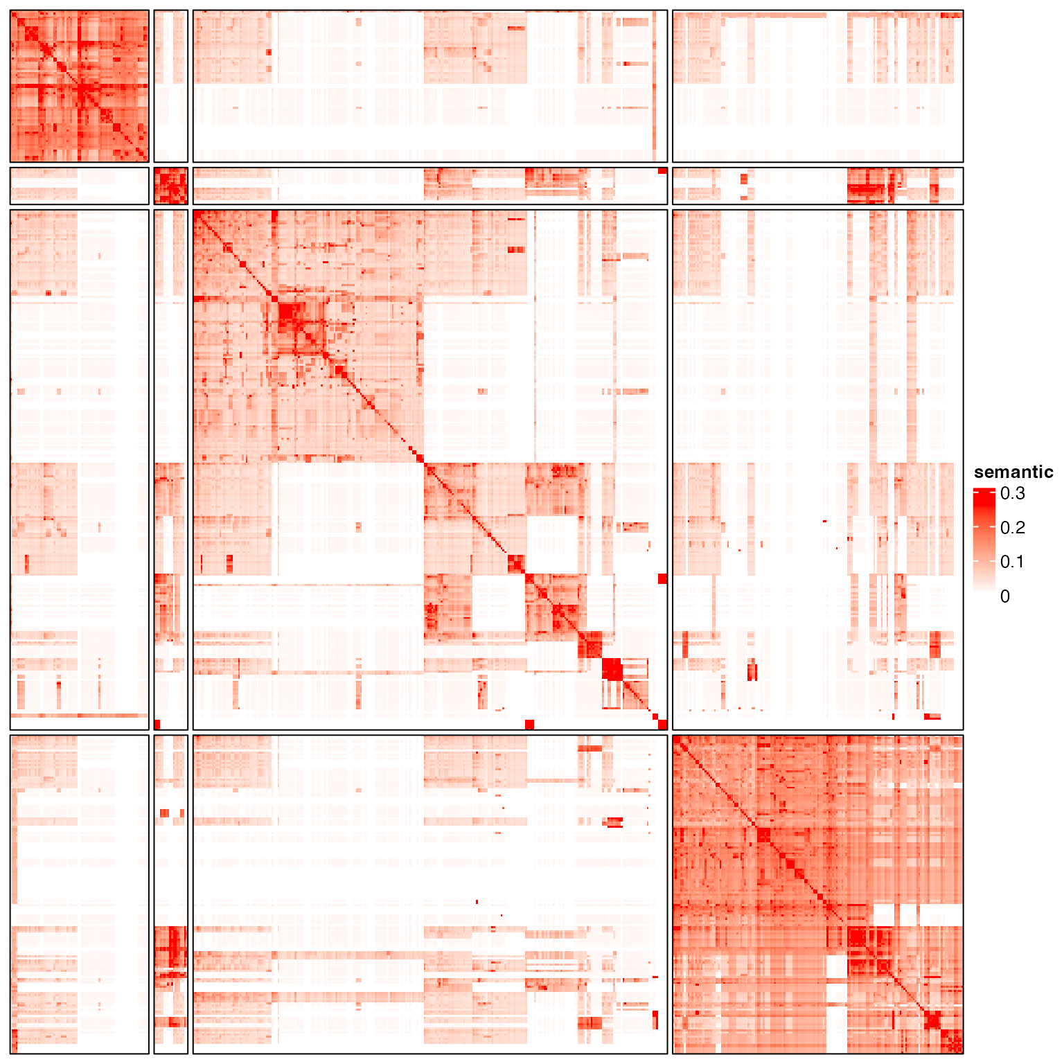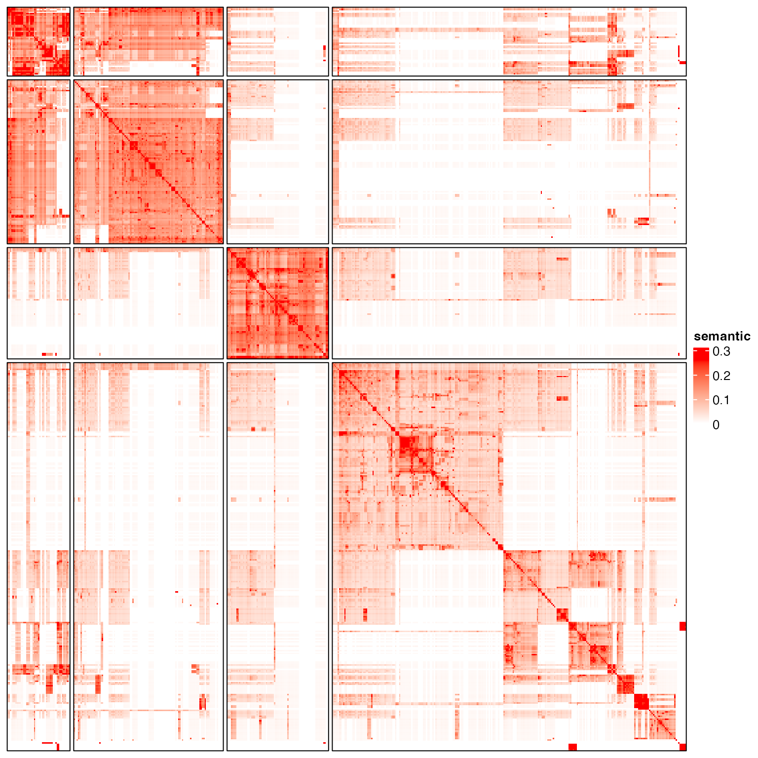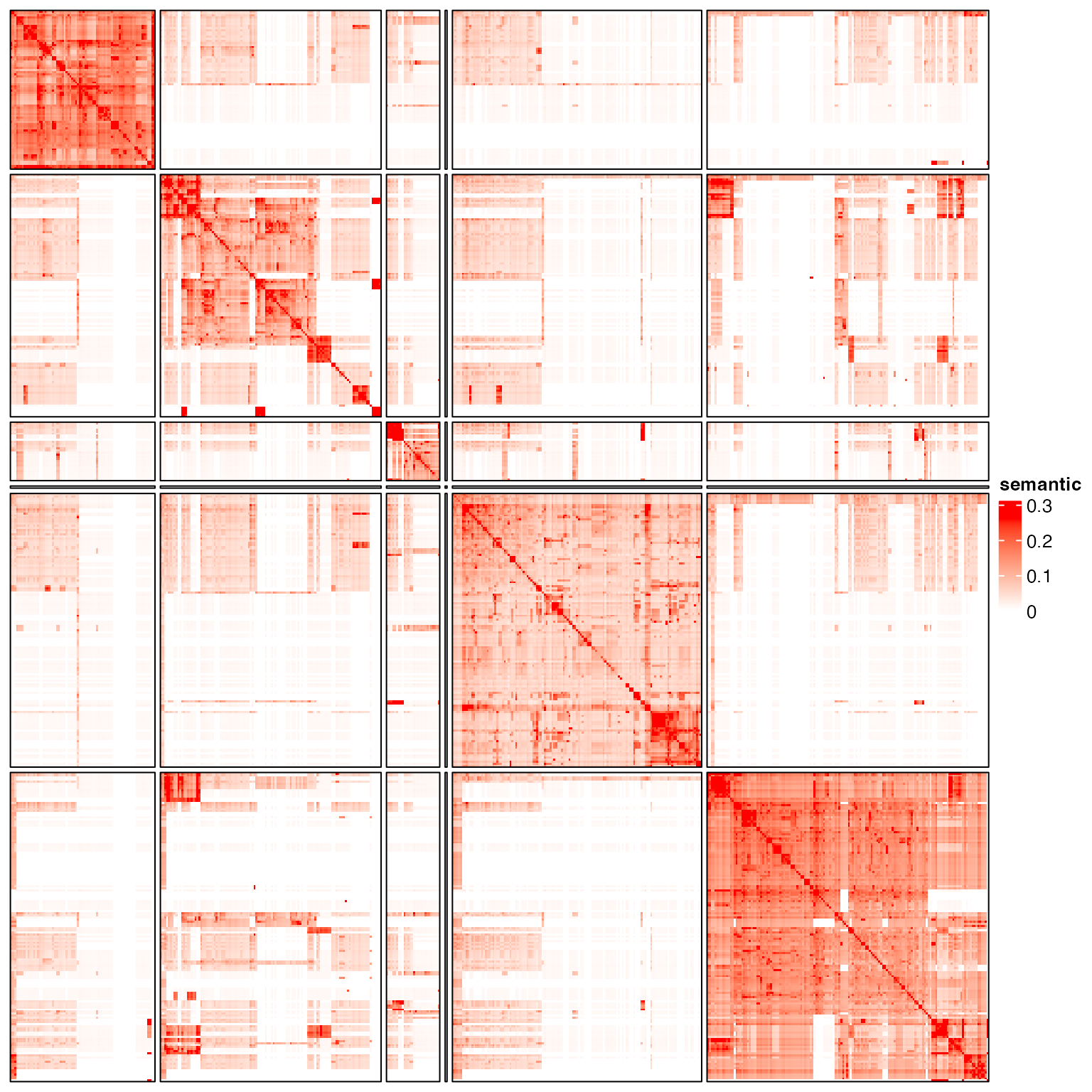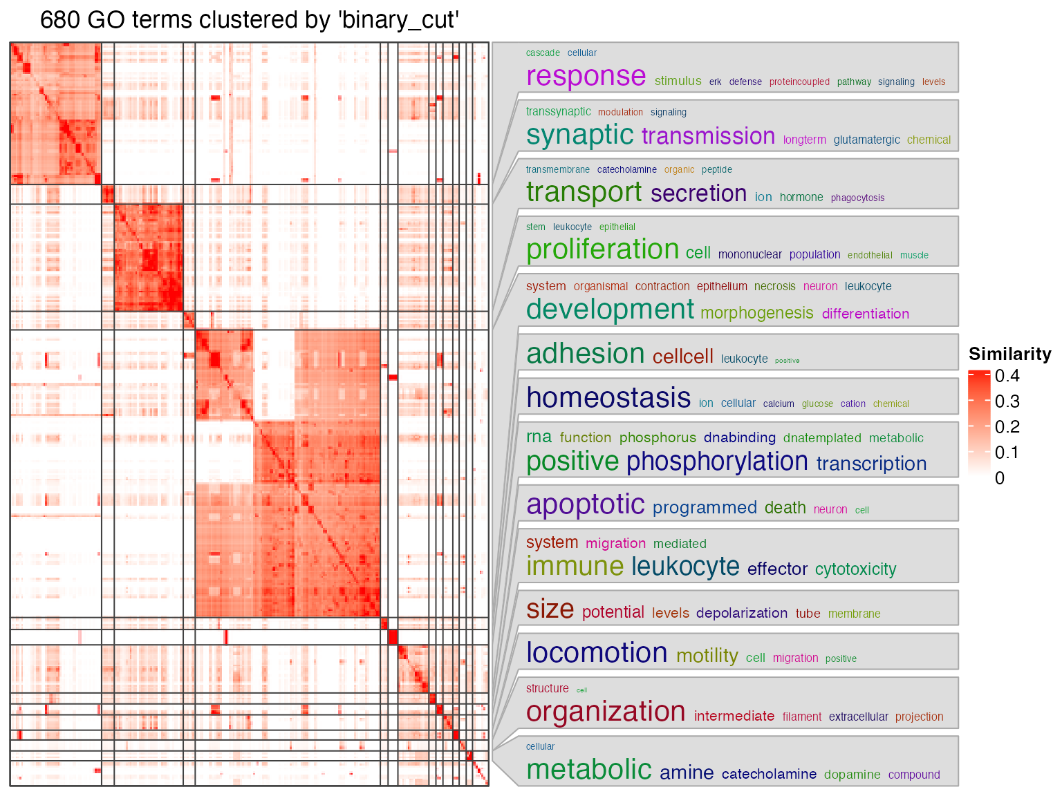 Clustering the gene sets is fairly easy. However, this is not the end of the analysis. We need to summarize the commonness of genesets in a cluster. Note the similarity is count-based, then these genesets must share some common genes, i.e., the driving genes that cluster the genesets.