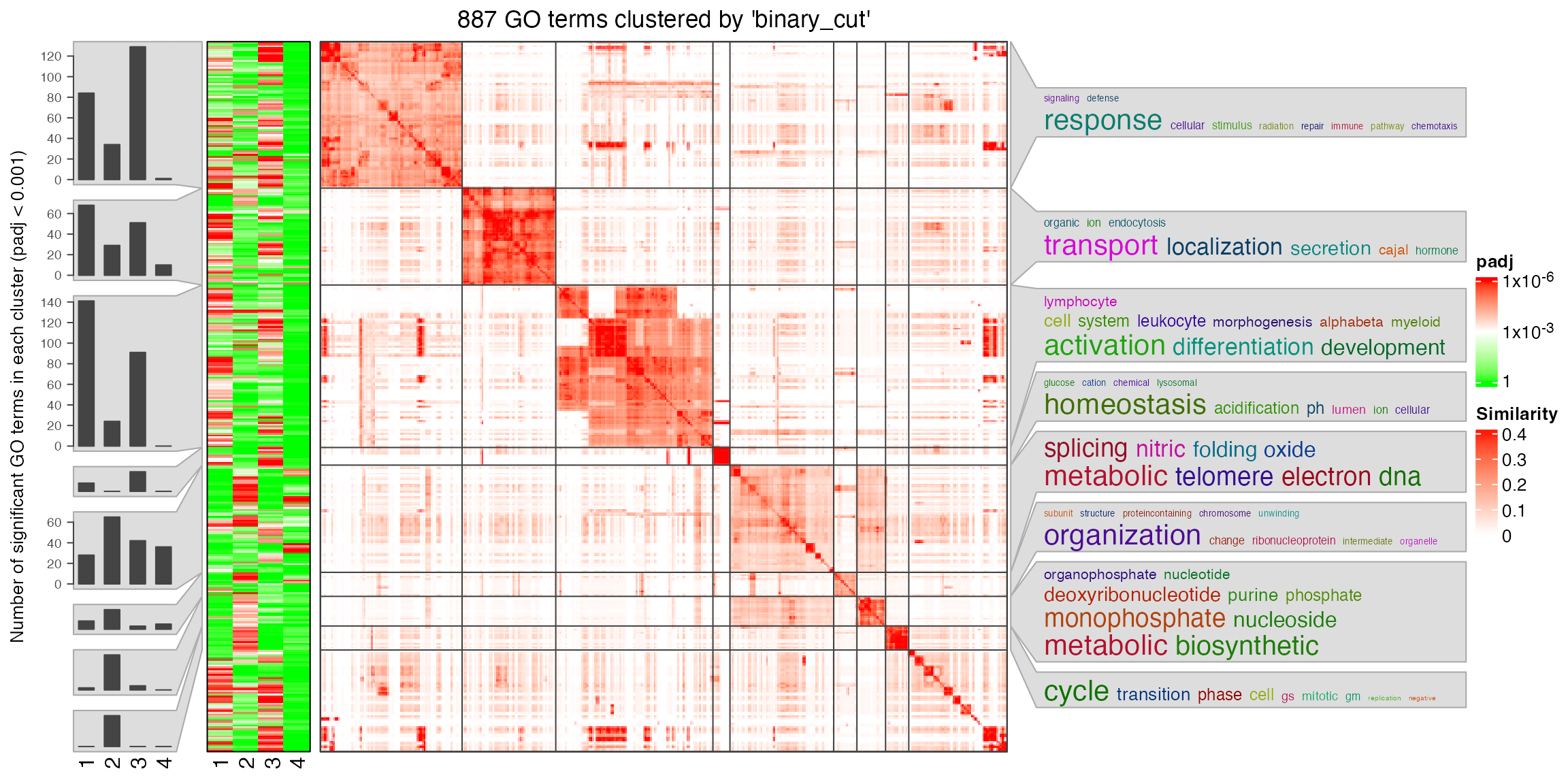 Now we have four groups of signatures genes. The next analysis is to compare enriched GO functions in the four lists of signature genes. The corresponding biological question is do these different signature genes have similar function or they exhibit specific functions?