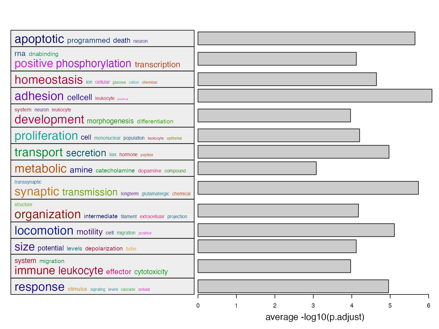 summarizeGO(df$gene_set[l], -log10(df$p_adjust)[l], axis_label = "average -log10(p.adjust)")