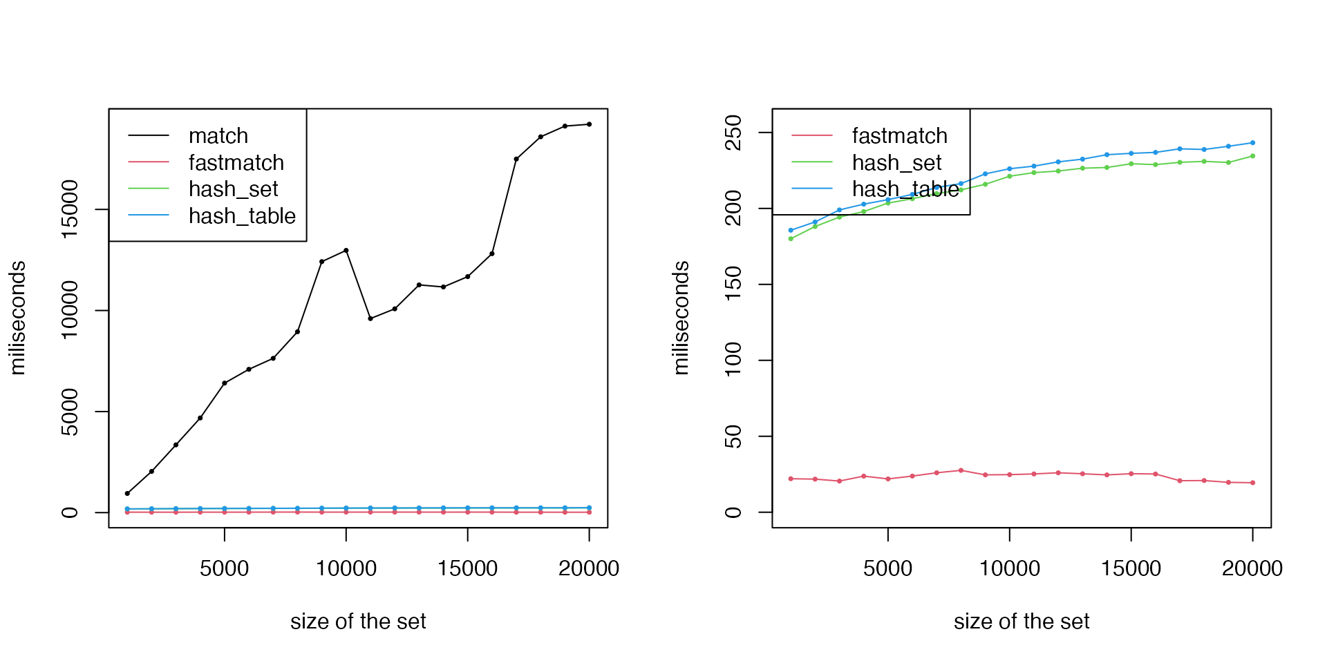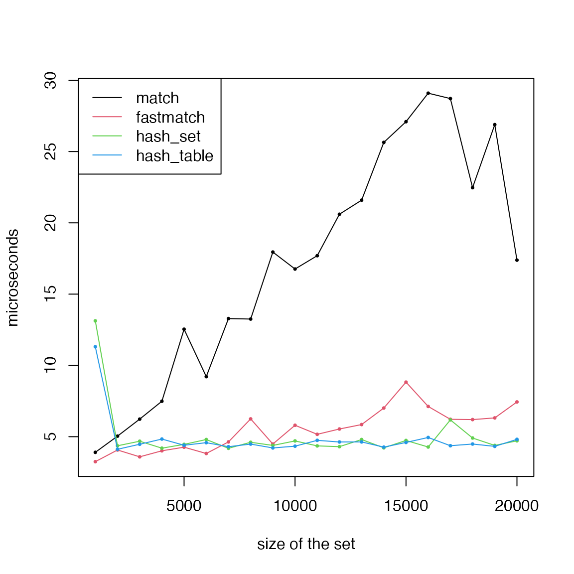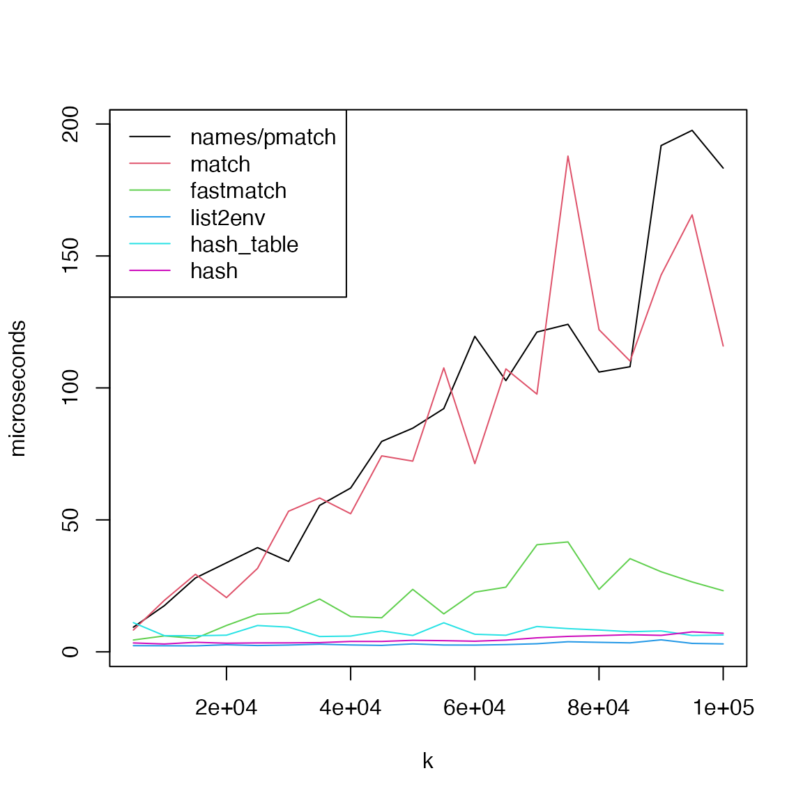 legend("topleft", lty = 1, col = c(1, 2, 4, 5, 6), legend = c("names/pmatch", "match", "fastmatch", "hash_table", "hash"))