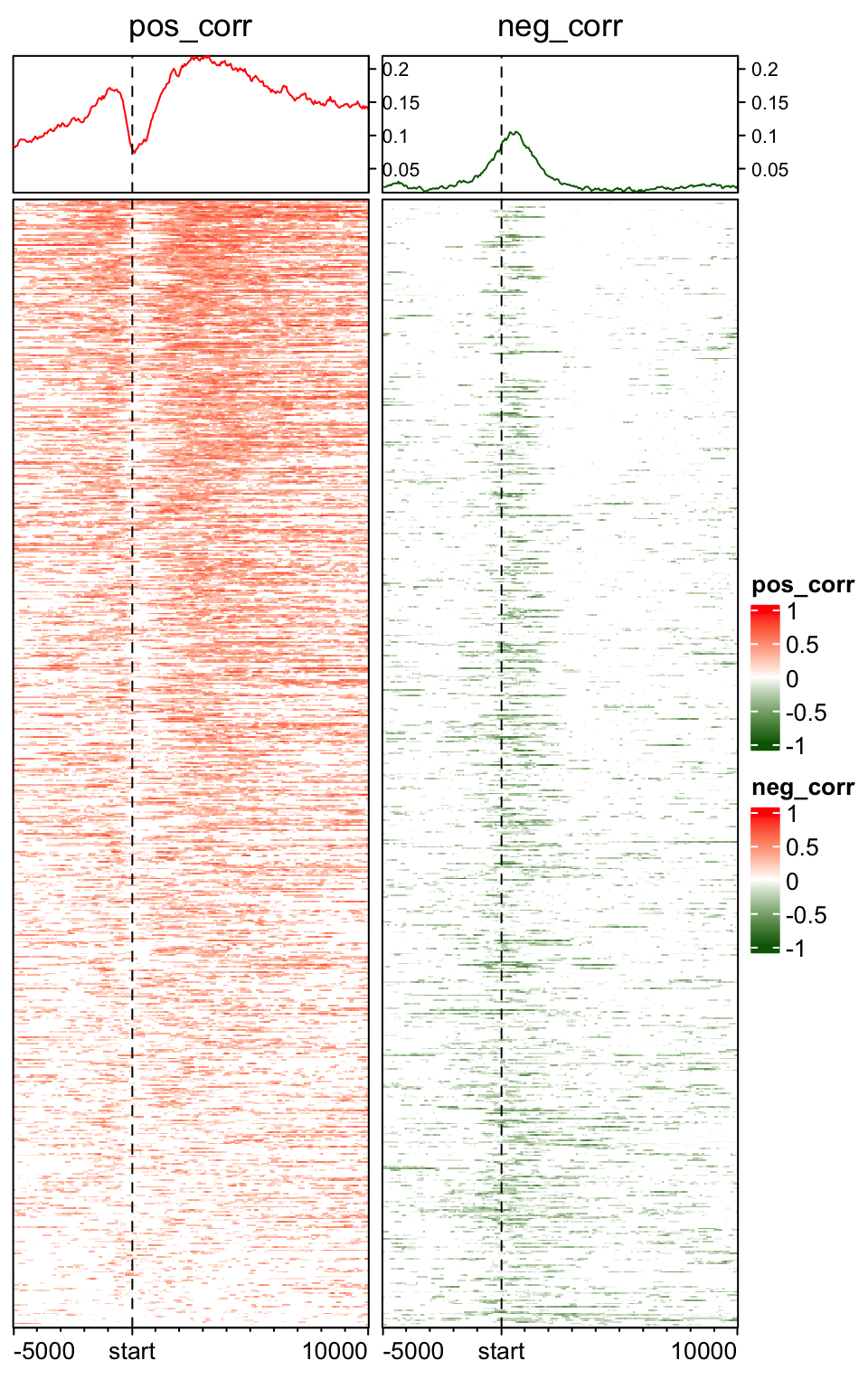 Sometimes we want to visualize the general correlation around certain genomic targets or how the difference between two subgroups looks like in the vicinity of e.g. gene TSS. In this case, the signals contain both positive and negative value and it makes more sense to visualize the enrichment for the positive and negative signals separatedly.