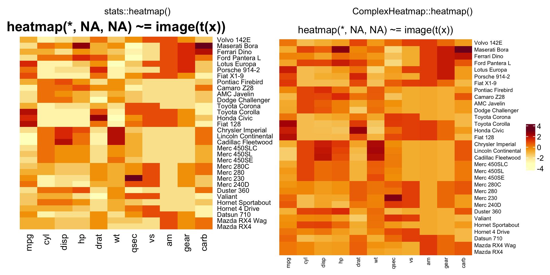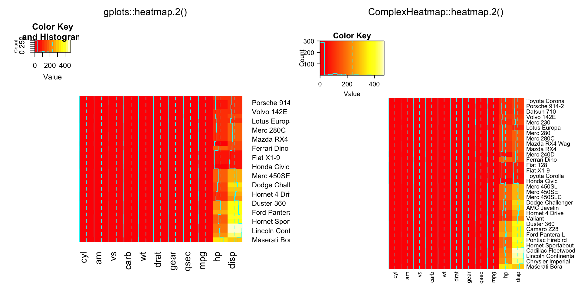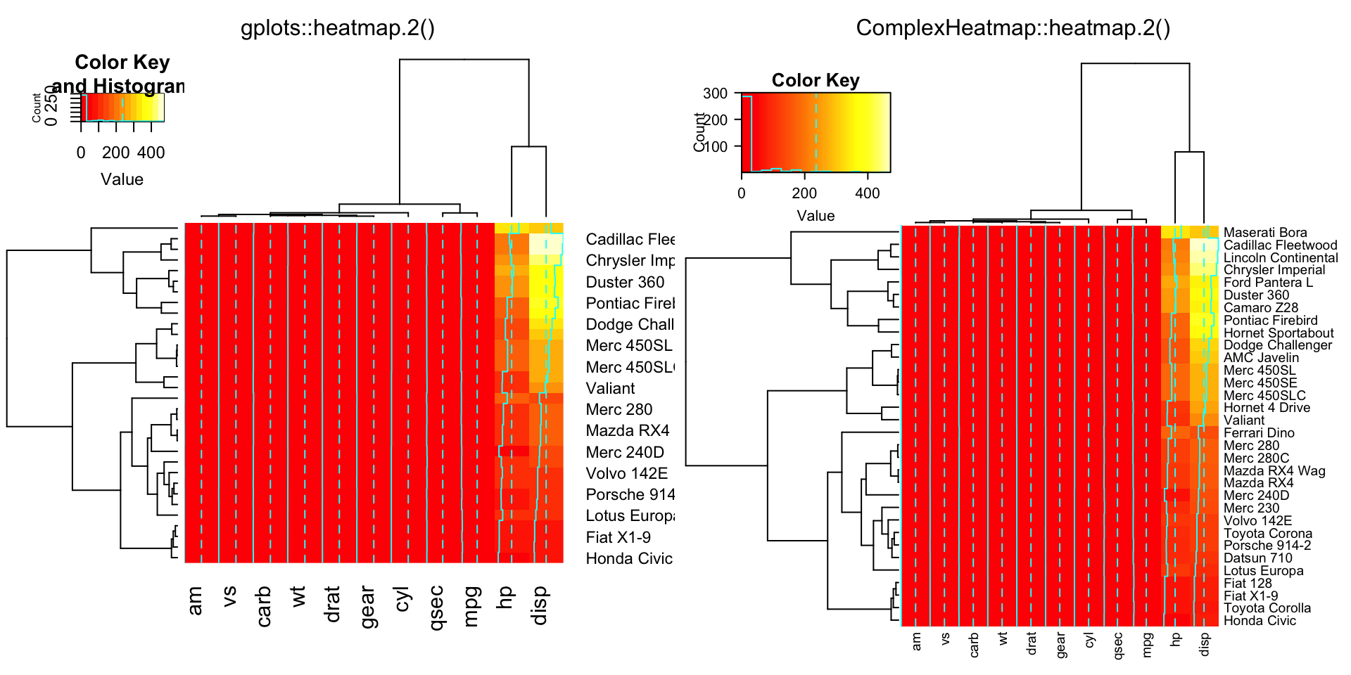 Some arguments in the two original functions are ignored in the ComplexHeatmap implementation, but there won’t be any error thrown out.