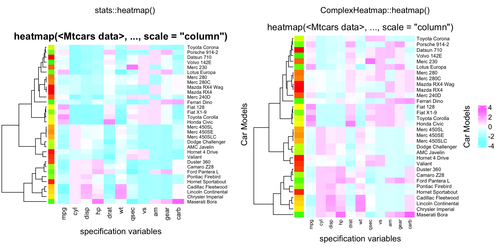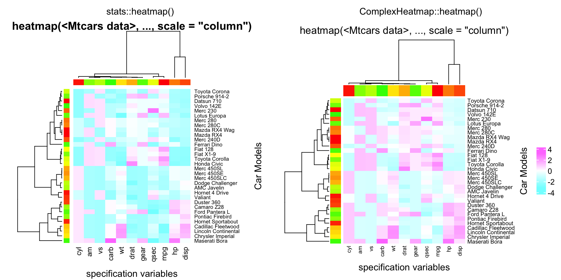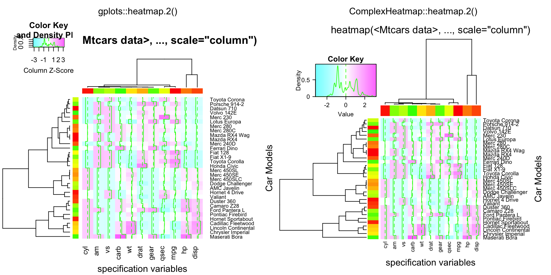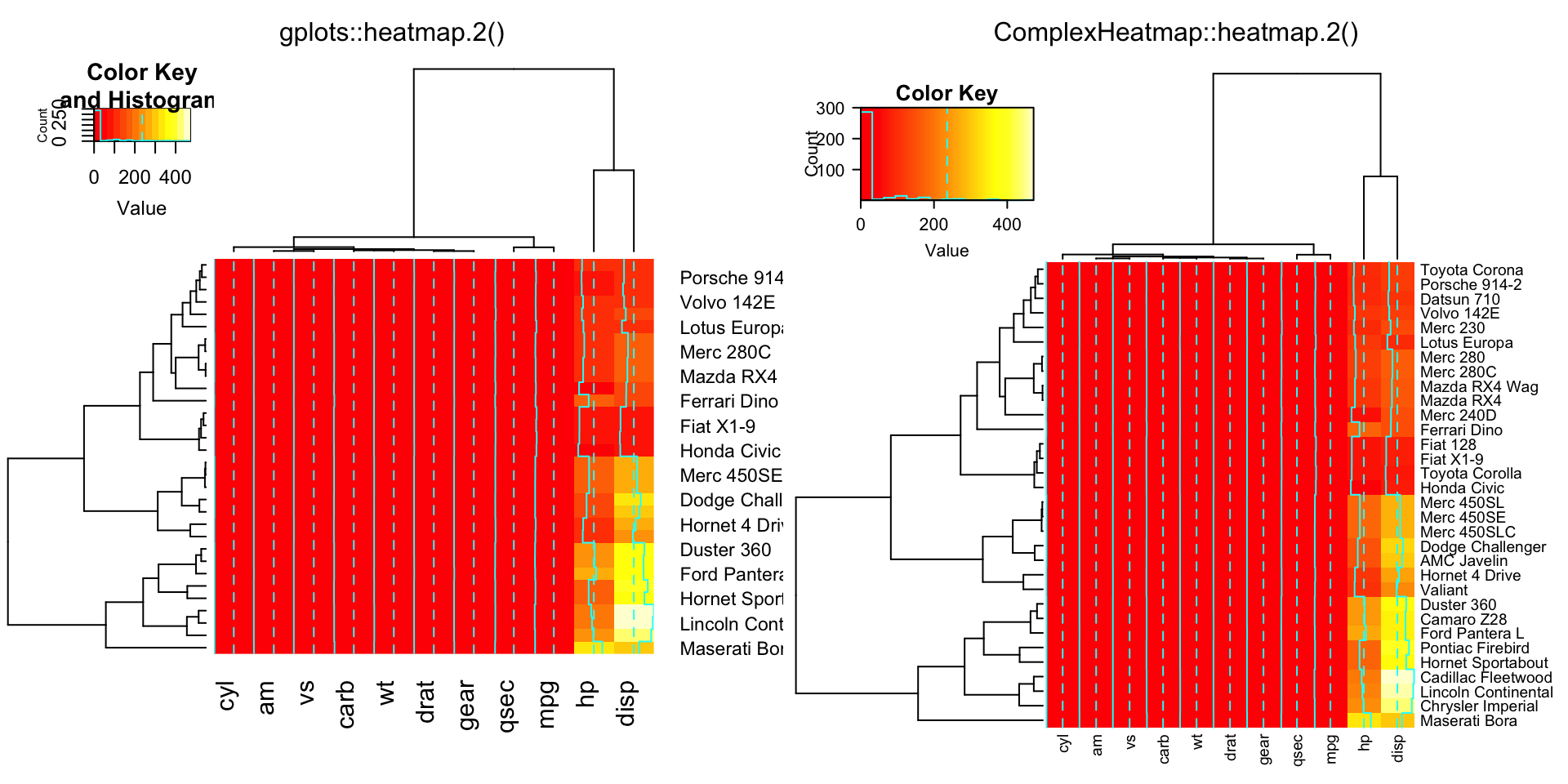 Some arguments in the two original functions are ignored in the ComplexHeatmap implementation, but there won’t be any error thrown out.