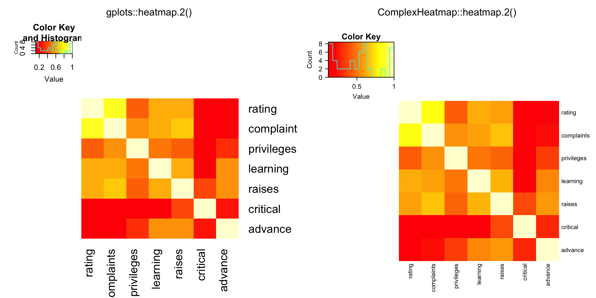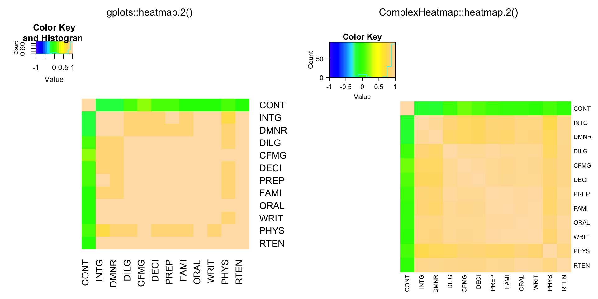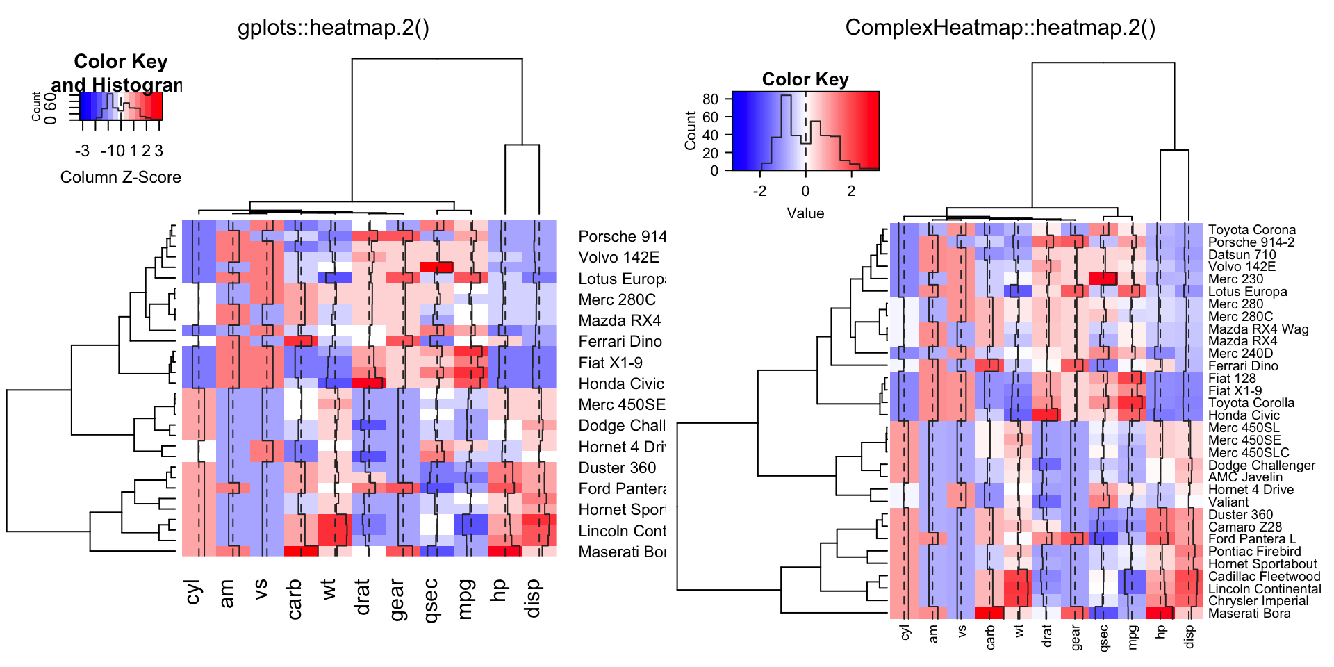 Then with ComplexHeatmap::heatmap() and ComplexHeatmap::heatmap.2(), you