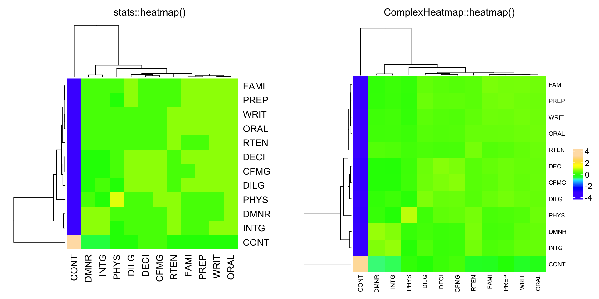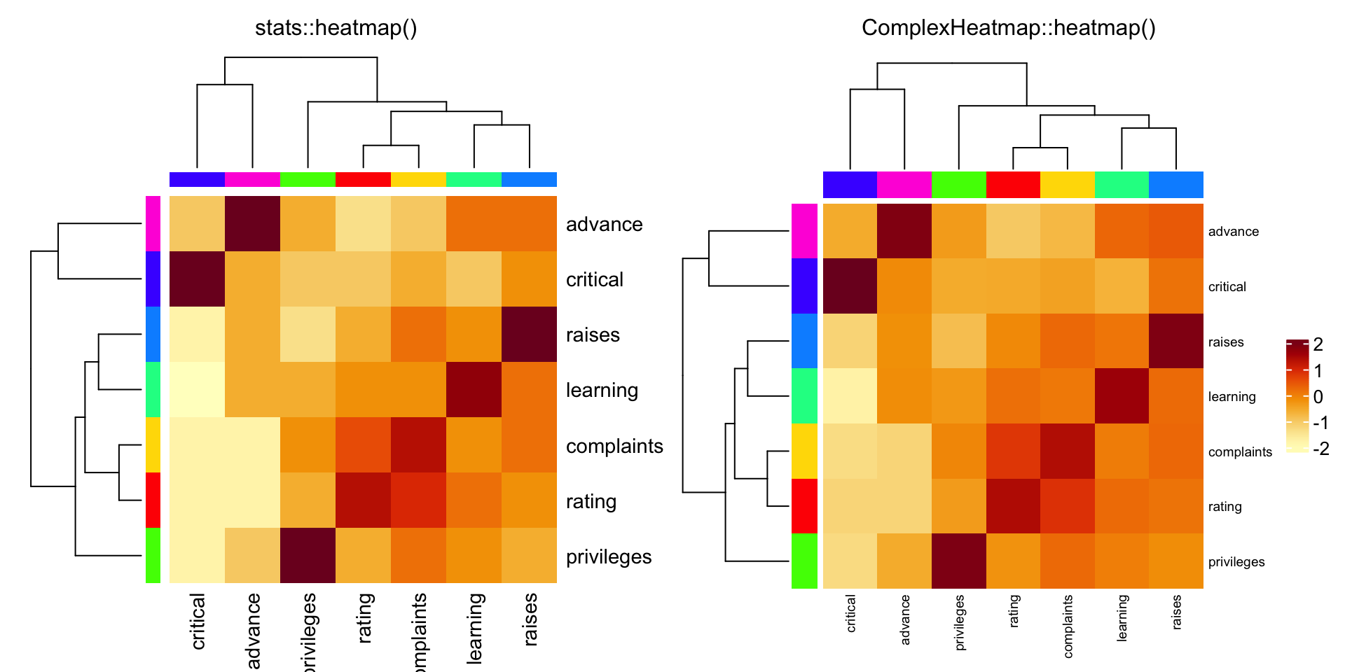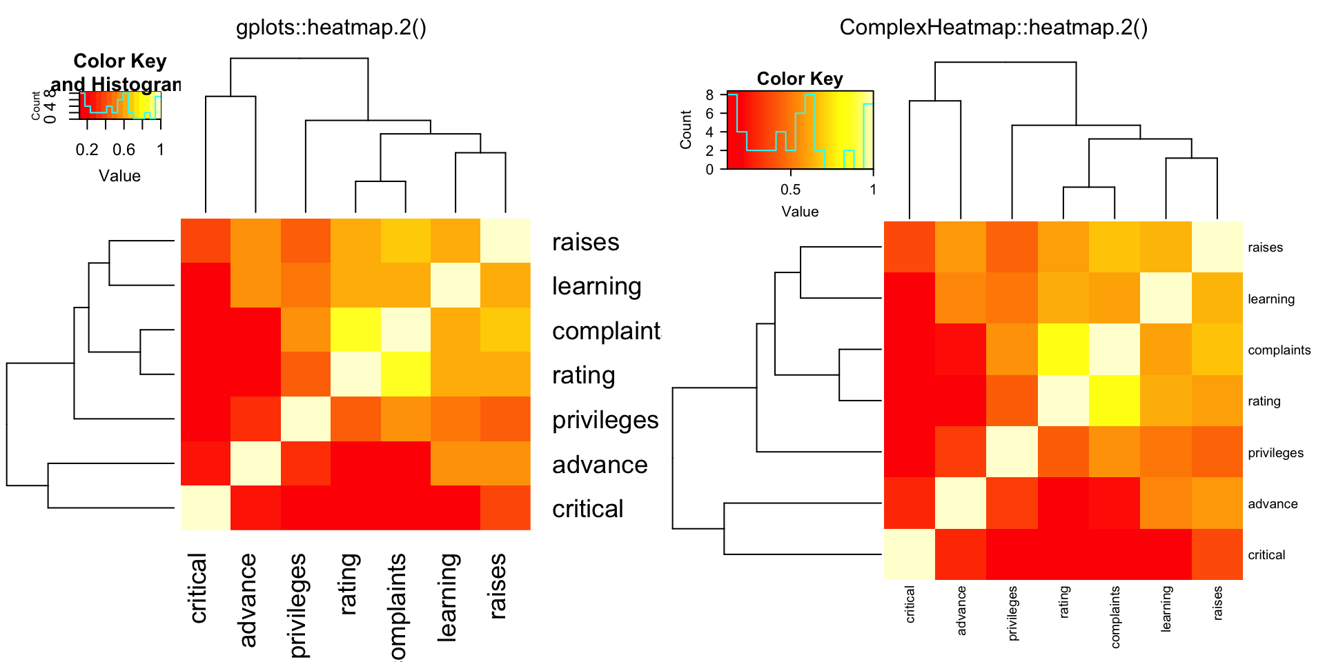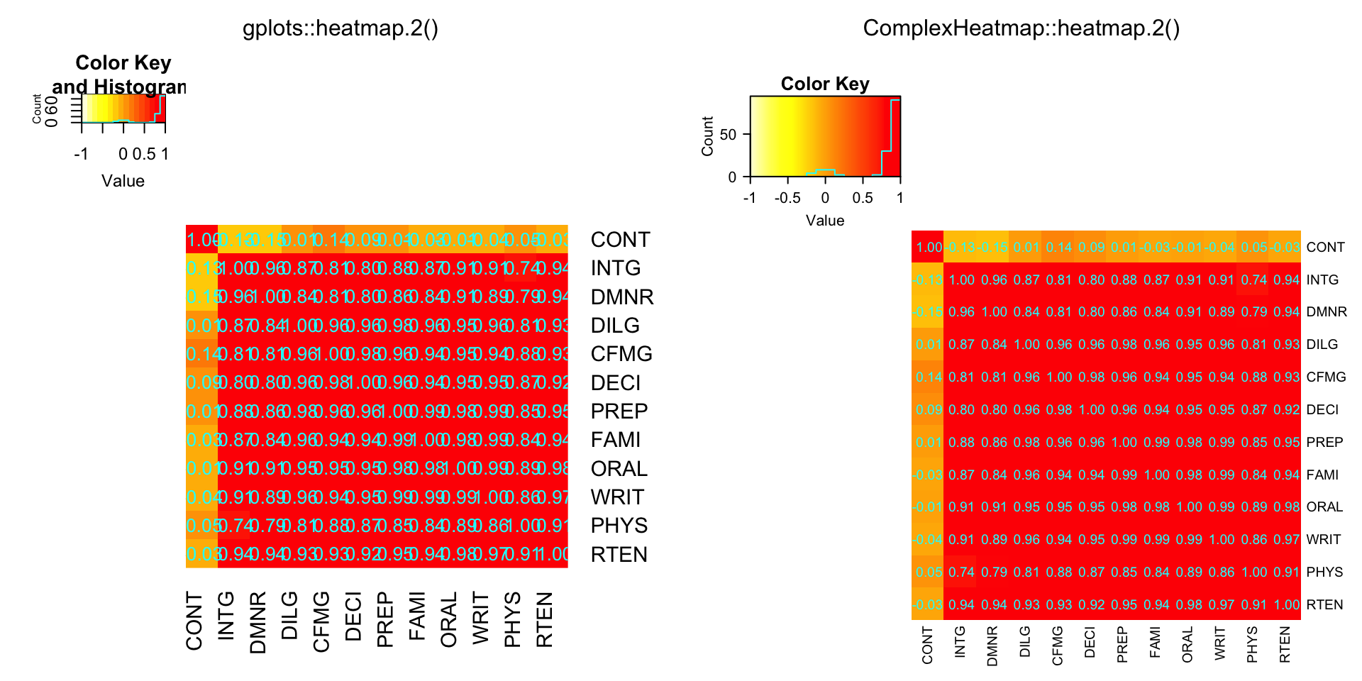 Then with ComplexHeatmap::heatmap() and ComplexHeatmap::heatmap.2(), you