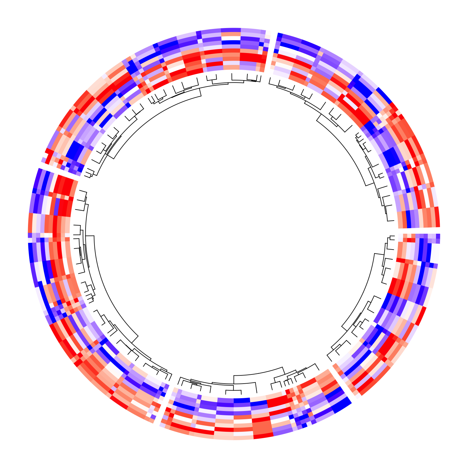 circos.heatmap(mat1, split = split, col = col_fun1, dend.side = "inside",