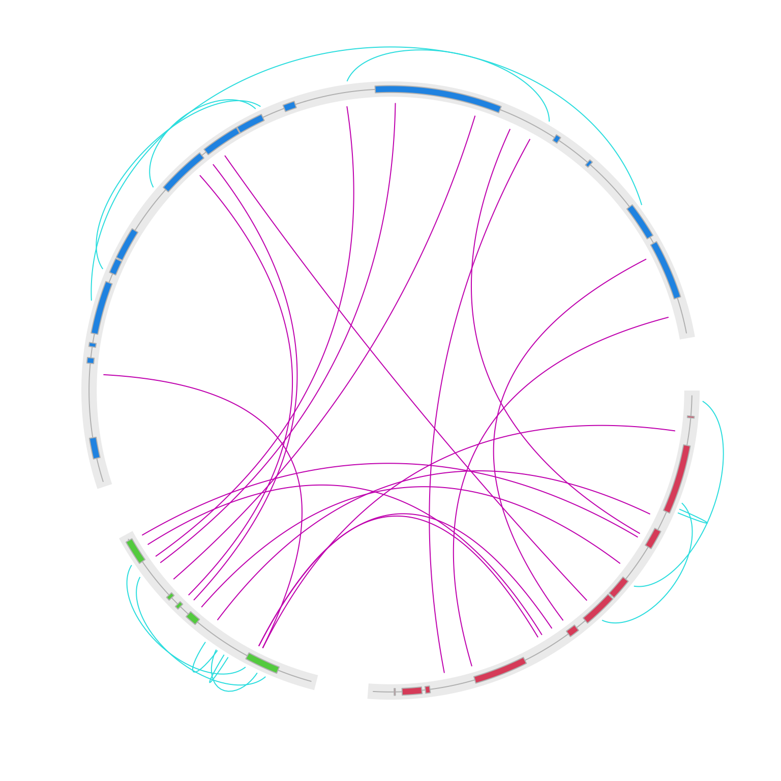 circos.link(link$gene1[i], link$x1[i], link$gene2[i], link$x2[i], col = 5, h = -0.1, rou = 1)
