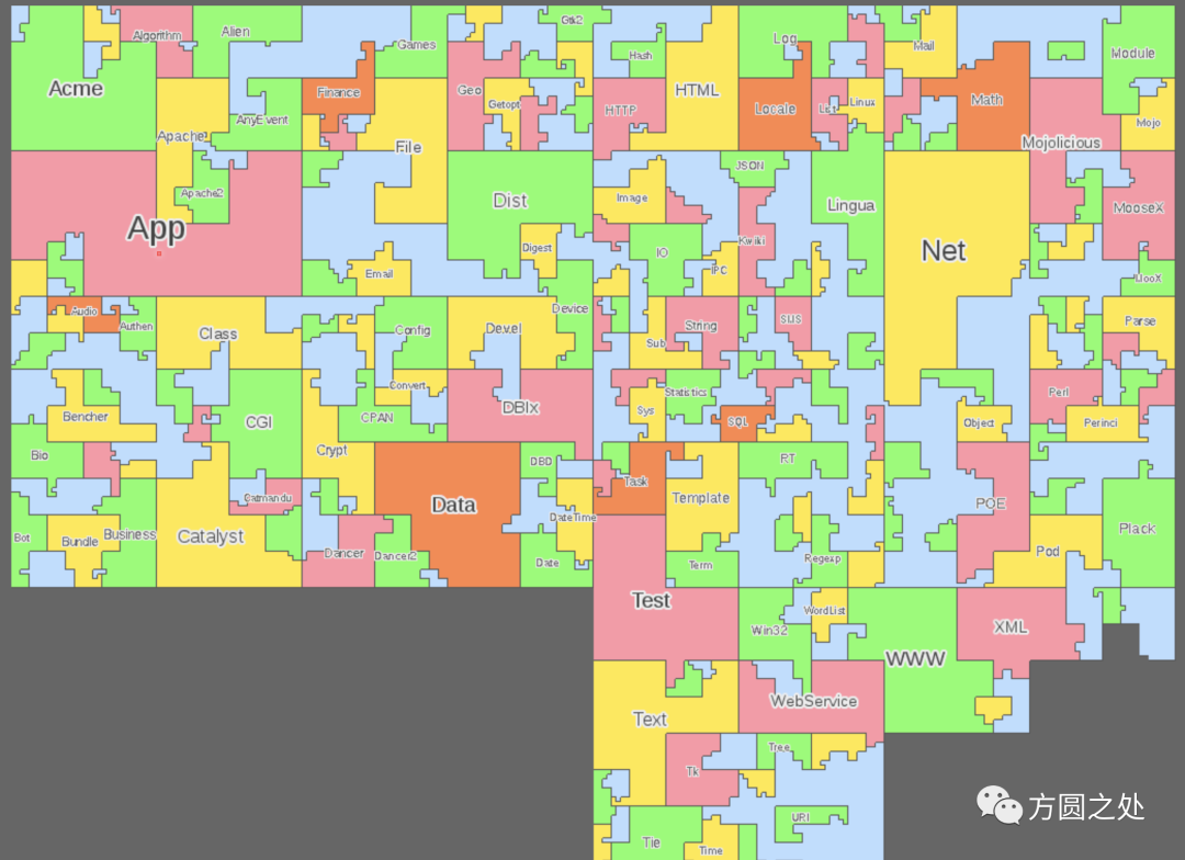 在网站 http://mapofcpan.org/ 上有一个非常好看的对CPAN Perl模块可视化的例子,如下图: