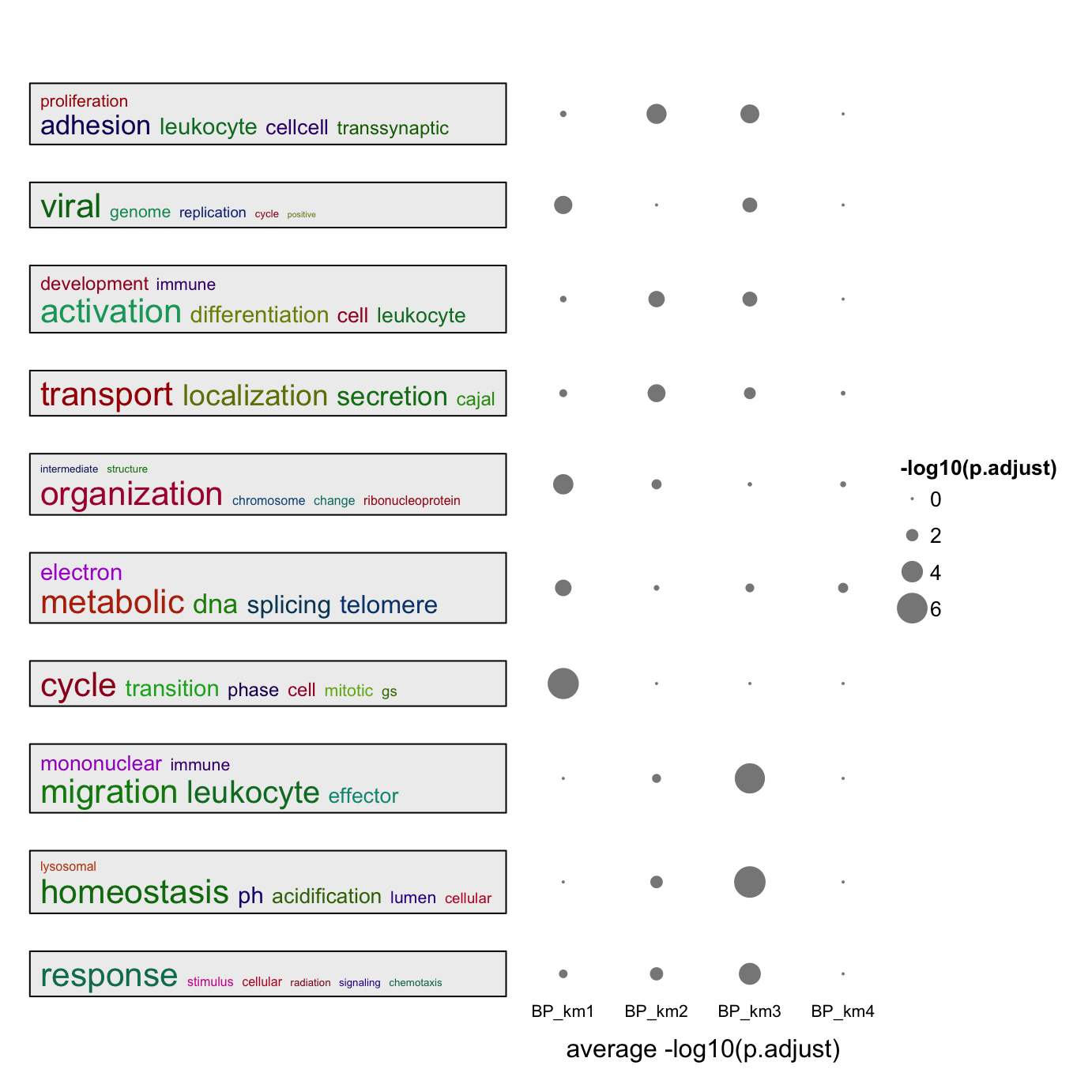 the mean of -log10(p.adjust) of GO terms in different GO clusters. On the left side, we still use the word clouds which