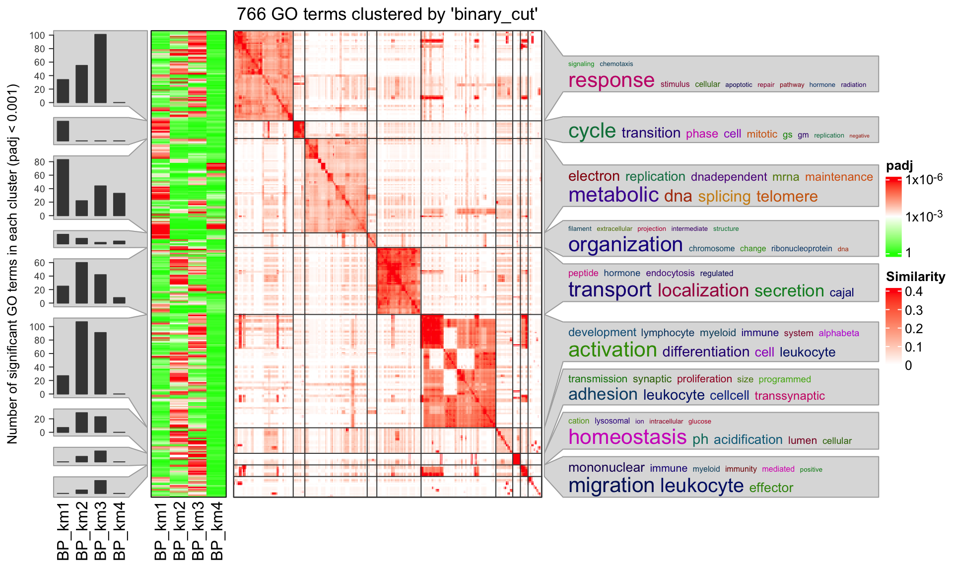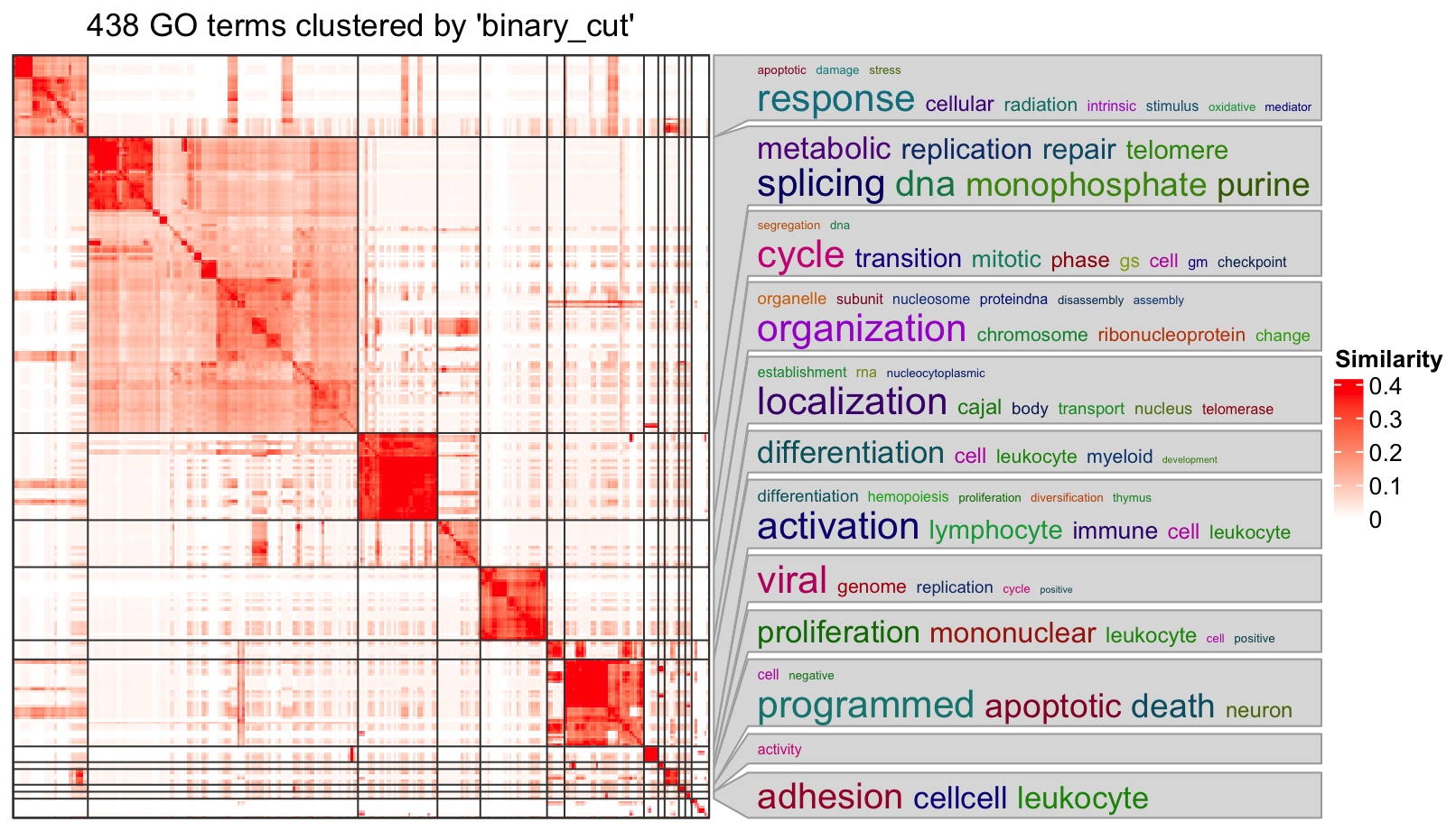 The plot looks good, but it still contains too many graphic contents. For example, the GO similarity heatmap