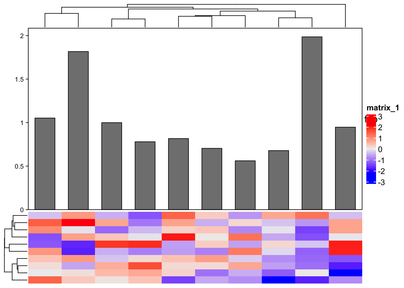 Heatmap(m, top_annotation = HeatmapAnnotation(foo = anno_barplot(x), height = unit(8, "cm")))
