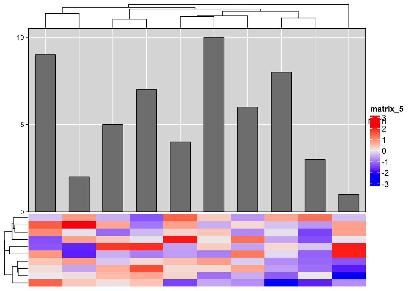 Heatmap(m, top_annotation = HeatmapAnnotation(num = anno_barplot(1:10), height = unit(8, "cm")))