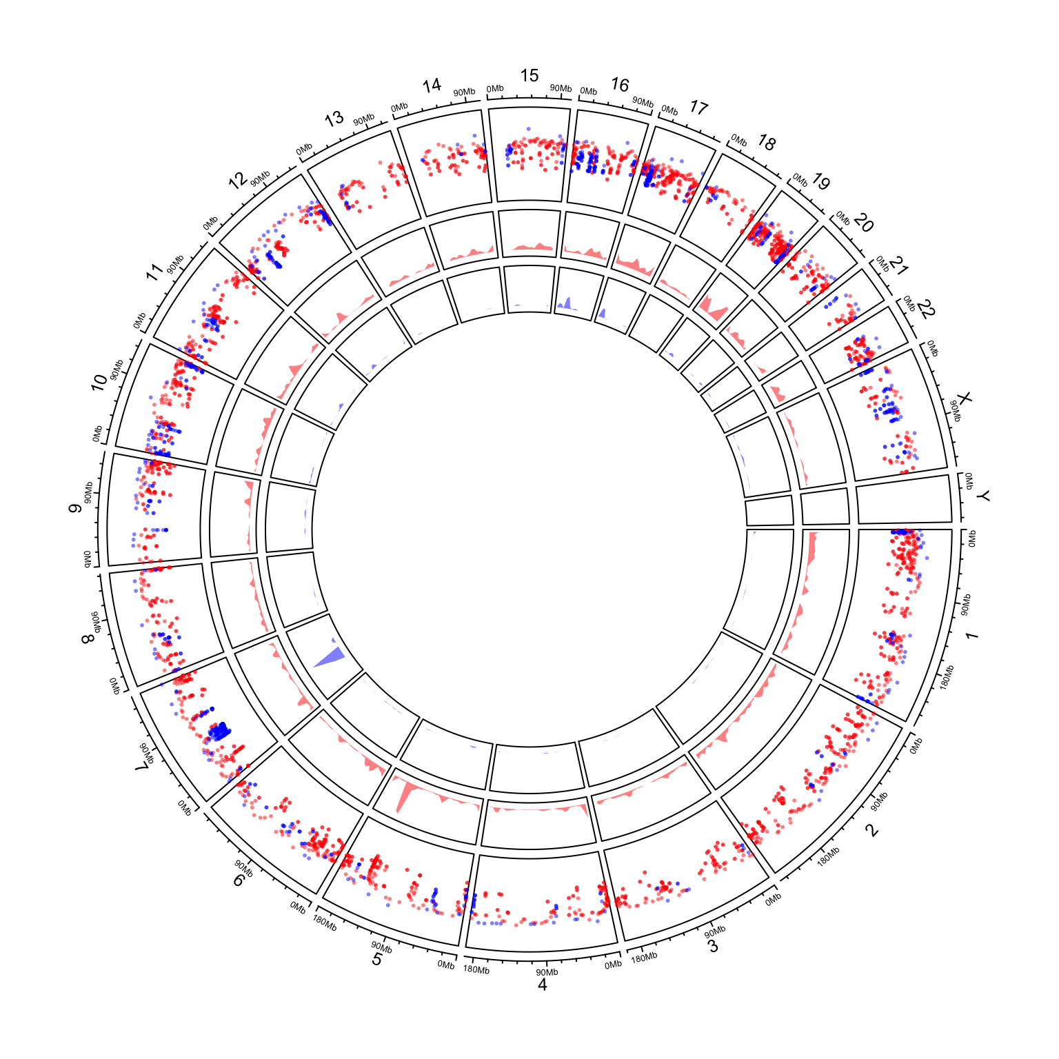 circos.genomicRainfall(bed_list, pch = 16, cex = 0.4, col = c("#FF000080", "#0000FF80"))