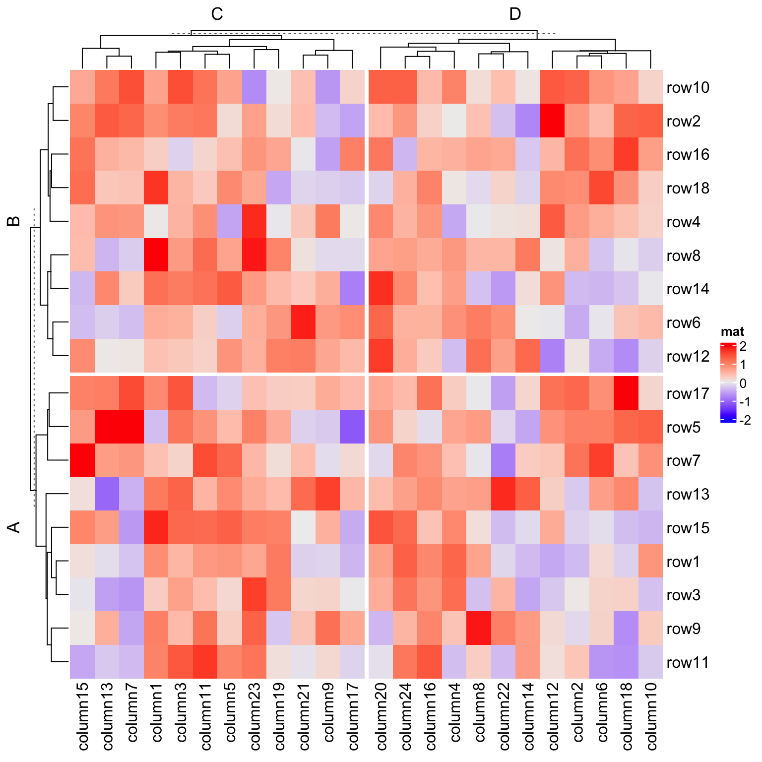 row_split = rep(c("A", "B"), 9), column_split = rep(c("C", "D"), 12))